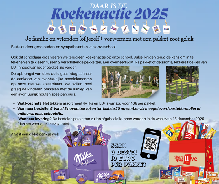 Ook dit schooljaar organiseren we een koekenactie op onze school. Jullie krijgen terug de kans om in te tekenen en te kiezen tussen 2 verschillende pakketten. Een overheerlijk Milka pakket of de zachte, lekkere koekjes van LU. Inhoud van ieder pakket, zie verder.
